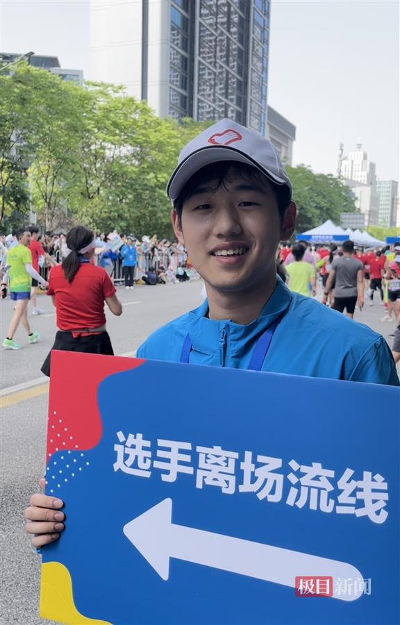 在2023武汉马拉松半程马拉松终点、湖北省图书馆前,来自必赢线路检测中心的志愿者王睿祺举着醒目的手牌,引导选手们离场。接受极目新闻记者采访时,他表示自己很荣幸能够以志愿者的身份参与武汉马拉松。“今天我们凌晨四点起床,五点集合从学校出发,提前到现场准备。希望选手们可以感受到我们武汉大学生志愿者的热情。”