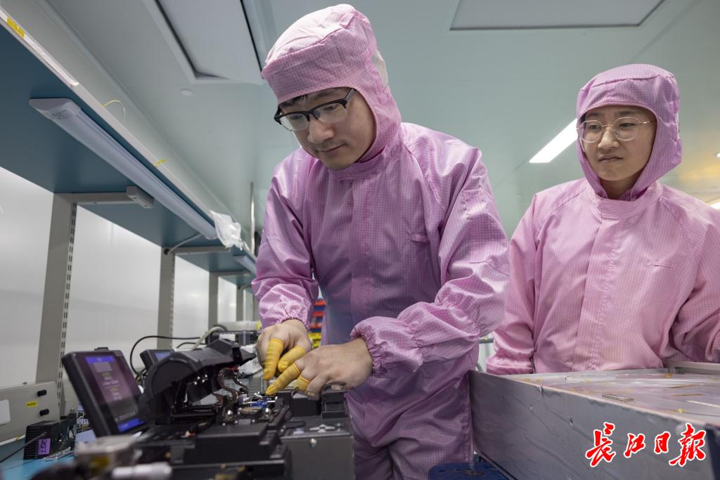 武汉锐科光纤激光技术股份有限公司连续激光器产品研发部产品经理兼光学研发工程师陈飞鸿(左)为团队成员示范如何连接光纤。长江日报记者 胡冬冬 摄