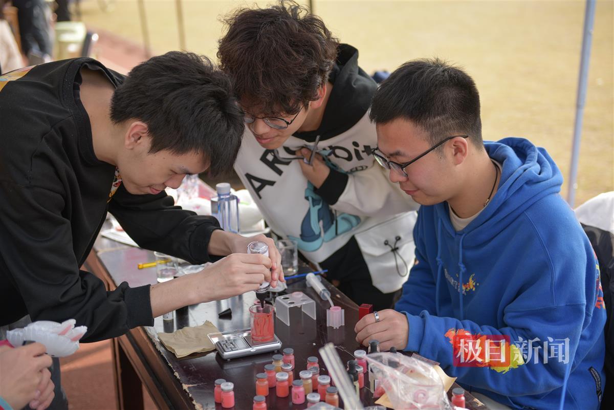 不远处弥漫着淡淡的药香味,吸引了不少学生驻足停留。玫瑰、薄荷叶、薰衣草、艾叶……学生们通过不同药草的搭配,制作出不同功效和香味的香囊。还有学院推出自制口红、石膏娃娃上色、手链编织等手工活动,展现了学生们的各种巧思。