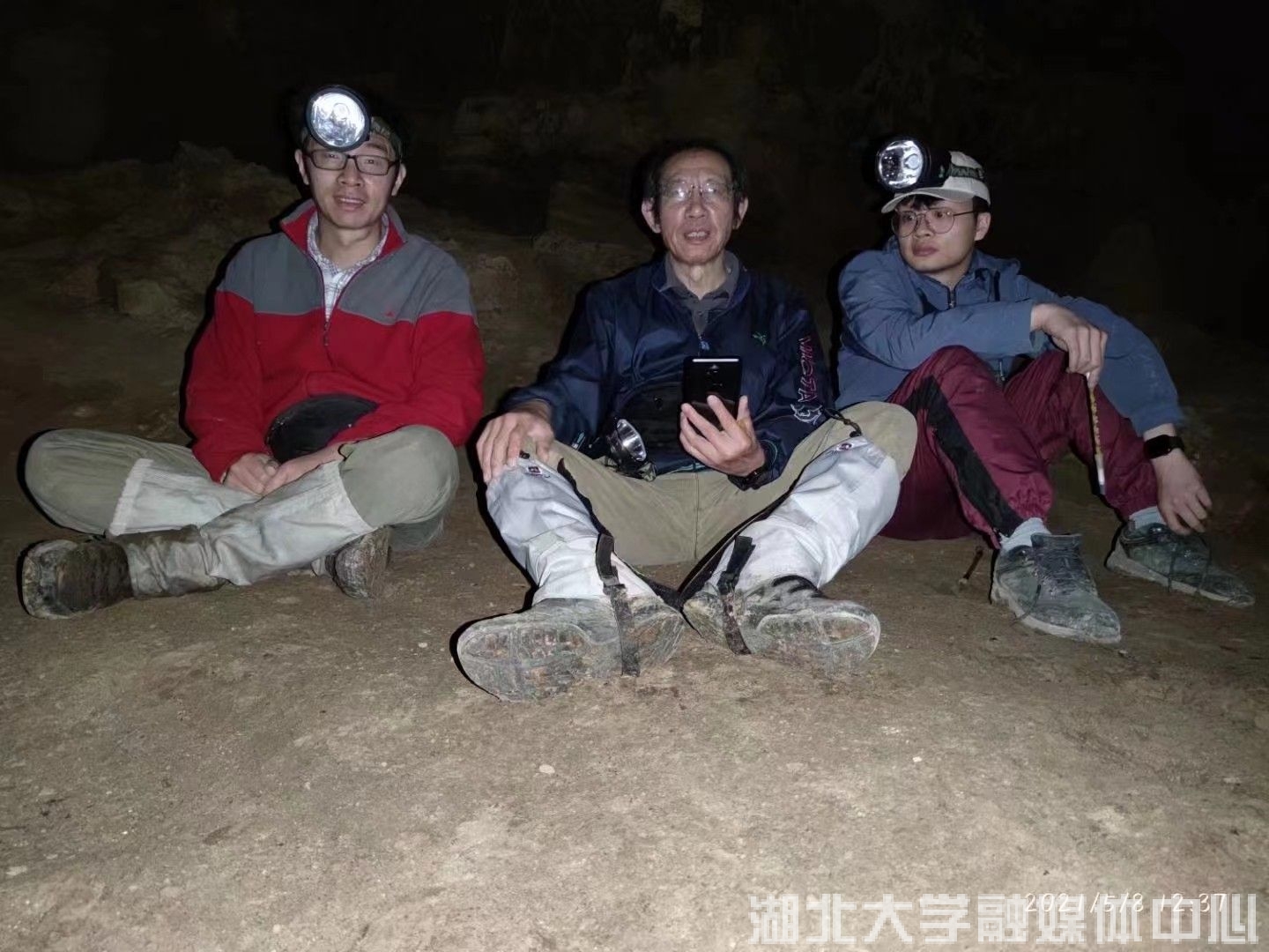 刘杰(左)和师生在贵州山洞中寻找蜘蛛。