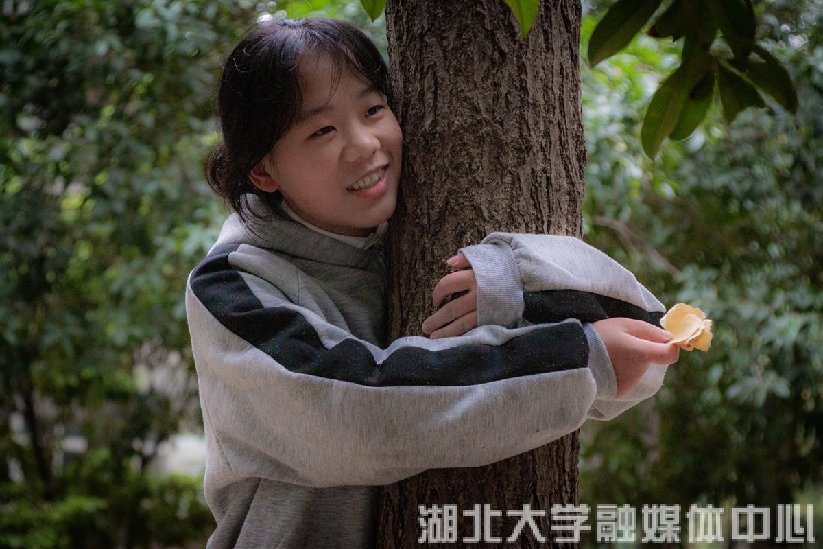 了解银杏的历史、寓意后,学生们纷纷来到银杏树下,观察痕迹、抚摸树皮、拥抱树干,用心体验银杏的感受,并以此为基础,现场编写银杏的故事并进行演绎。