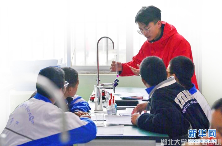 支教团成员指导学生做化学实验