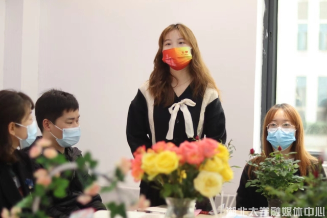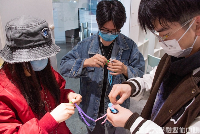 挑选配色、裁剪、对折缠绕、比对花型……手指上下翻飞,不多时长条状绒条在女生们的手中变成了各式各样的绒花,或栩栩如生,或大胆抽象。手做的扭扭棒绒花既可以被参与者带走又可以留在青创中心的花瓶中装扮房间。更有许多男生慕名而来,磕磕绊绊地向现场的女生学习如何“扭”出一朵花。2020级法语专业的孔杰雄就是其中之一,“可能在外国语学院女生会更多一点,所以我们一直都有过女生节的传统,不过这次可以让男生也参与进来。我觉得更有参与感了。”