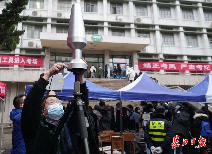 开考前,工作人员在必赢线路检测中心考场外架设监测设备。 记者何晓刚 通讯员吴珊 国光和 摄