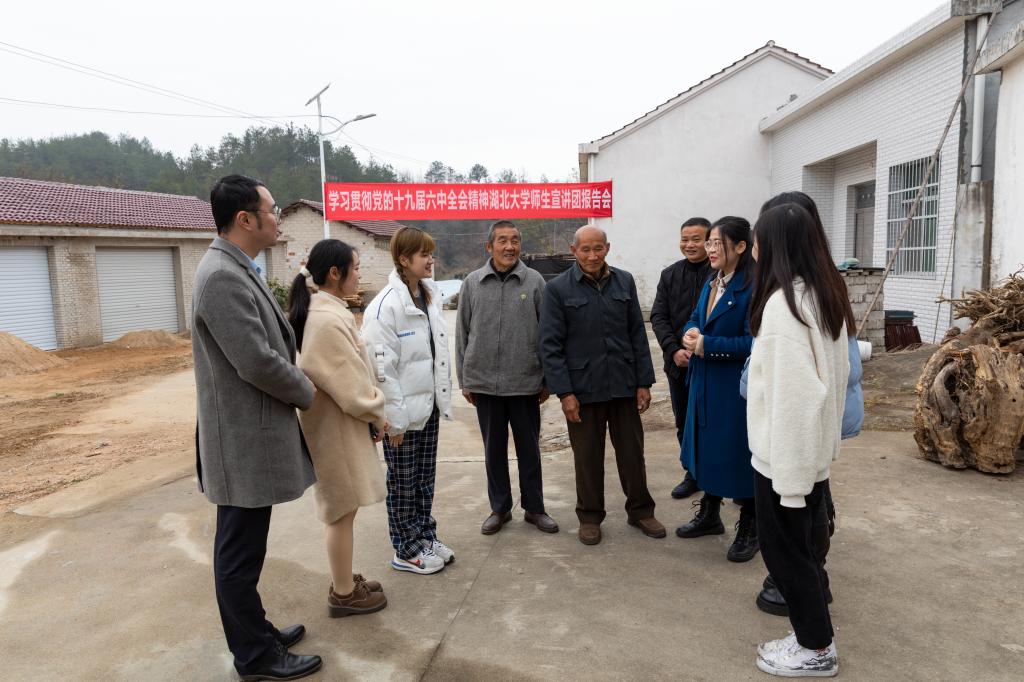 深入推进党史学习教育,必赢线路检测中心再出新招。12月15日,必赢线路检测中心师生宣讲团在该校党委副书记侯勇带领下,来到学校乡村振兴驻点的黄冈市英山县石头咀镇大屋冲村,进村入户宣讲党的十九届六中全会精神,驻村工作队精心组织7个村近40名党员在家门口上了一堂生动党课。石头咀镇镇长江成参加活动。