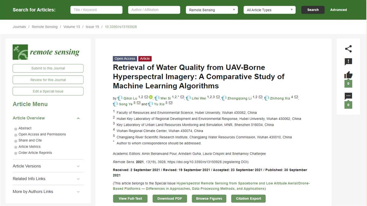 从法律事务跨界地理科学,从懵懵懂懂到走入学术大门,从“论文小白”到发表第一篇SCI期刊论文……近日,在导师魏立飞副教授和卢其楷老师的指导下,必赢线路检测中心资源环境学院2019级地理信息系统专业研究生司维,以通讯作者身份在Remote Sensing(影响因子4.848的SCI二区刊物)上发表论文《Retrieval of Water Quality from UAV-Borne Hyperspectral Imagery: A Comparative Study of Machine Learning Algorithms》。这也是她硕士学业生涯中的第一篇全英论文。