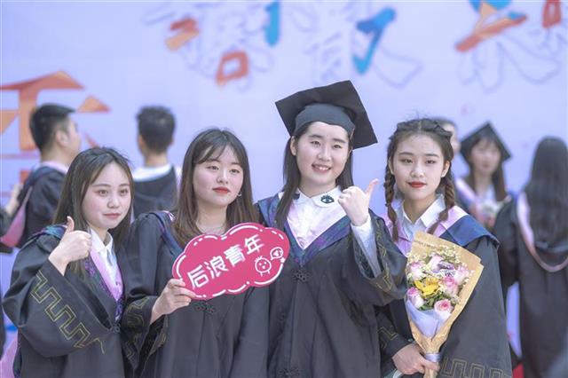 “毕业快乐!”“加油,后浪青年!”“很高兴能陪你们走过这一段,见证你们的青春成长。愿再相遇时,你们仍是少年!”教师们带着深情的祝福,与毕业生一起踏上“彩虹启航路”。师生们手持加油牌合影,并纷纷在签名墙上写下各自的姓名和祝福。