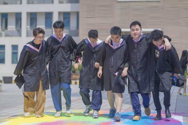伴随着动感音乐,257名毕业生们结伴同行,鞋底沾上自己喜欢的彩粉,手拿花束或气球,一路从最初的阳逻校区“平江东路”走到校本部“友谊大道”,再到学院所在的“逸夫楼”,一步一印,形成一条绚丽的“彩虹启航路”。