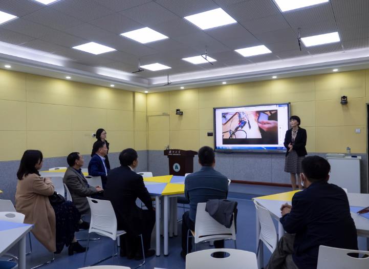 会后,与会领导、嘉宾走进湖大综合实训大楼、田家炳教育学院内,参观考察教师职业训练中心部分场所。智慧教室配备有高清云台摄像机、智能音频采集系统等教学高新硬件设备,为师范生专业实践课程提供丰富资源。在虚拟化、数字化一体的虚拟演播室,拍摄视频可与虚拟场景数字化合成为慕课形式。微格教室主要用于新晋教师培训与师范生教学技能培训,智能化摄像提供多角度视频,供学生进行讲解训练的个性化指导与自我提升。普通话语音训练室里高标准普通话模拟测试系统,为高校首例。远程观摩教学、局域网联网教学、互联网在线教学、电子书包智慧教学……信息化教学实验室实现信息化教学技能训练。粉笔书法训练室与软笔、硬笔书法训练室在专业的书法教学、培训、练习、测评等方面融入先进的信息化教学系统,将传统课堂与现代技术深度融合,打造智能化的粉笔、软笔、硬笔书法教学空间,对提升师范生书法素养及能力有着重要意义。