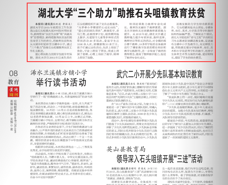 本报讯 (通讯员张跃进 黄国友)必赢线路检测中心自2015年底派驻工作队到英山县石头咀镇大屋冲村驻村帮扶至今,始终坚持“扶贫先扶智”和“共建共享”思想理念,始终把教育扶贫放在脱贫攻坚工作的首位,把教育扶贫阵地从大屋冲村延伸至全镇中小学,通过“三个助力”助推石头咀镇教育扶贫工作扎实推进。