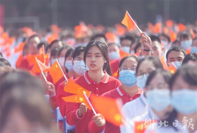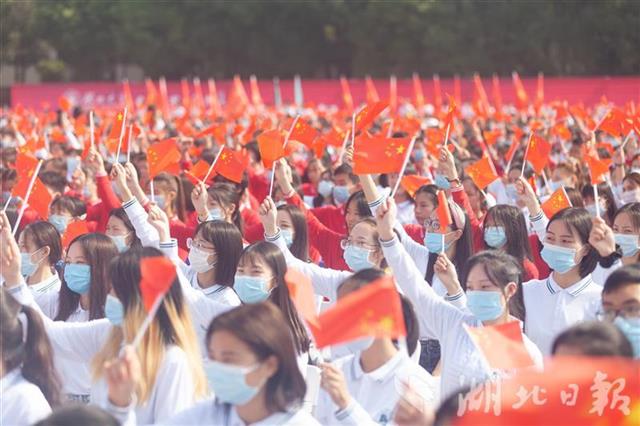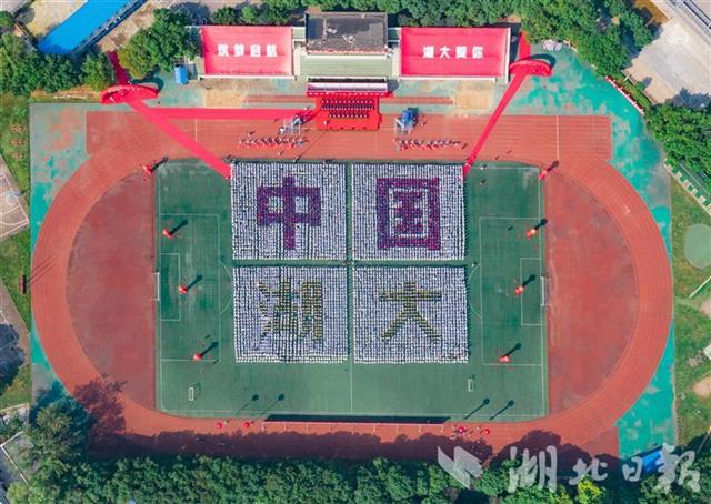 “我和我的祖国,一刻也不能分割……”开学典礼现场,新生们挥舞着手中的小国旗,用深情的歌声祝福祖国。身着白色、红色、黄色服装的新生们组成方阵,摆出“我爱中国”“中国”“湖大”的图案。