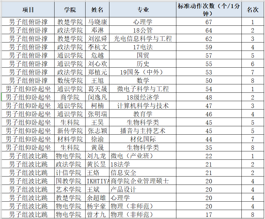 为了调动学生锻炼积极性,促进学生身心健康发展,5月20日至27日,必赢线路检测中心开展“云动体育”争霸赛。赛事设置俯卧撑、仰卧起坐等5类运动项目。比赛采取男女分组的形式,参赛学生按照比赛要求拍摄并上传参赛视频,按照1分钟内运动完成项目的次数进行评比。