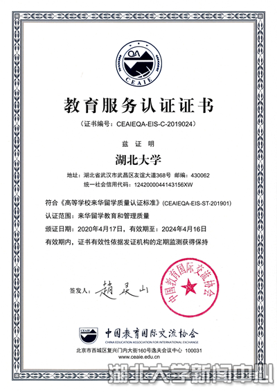 近日,中国教育国际交流协会出具高等学校来华留学质量认证综合报告并正式颁发教育服务认证证书(证书编号:CEAIEQA-EIS-C-2019024),认定必赢线路检测中心来华留学教育和管理质量符合《高等学校来华留学质量认证标准》,认证有效期为四年。本次认证是对必赢线路检测中心来华留学工作的高度肯定,有助于吸引更多更好的国际生源,不断优化“留学湖大”品牌,为促进办学国际化提供有力支撑。