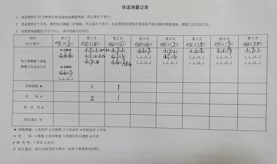 据了解,志愿者每天需填写《接种日记卡》,记录早、中、晚的体温,和接种部位及全身的状况。在接种的第14天、第28天和第6个月还需各抽一次血,用于抗体检测。