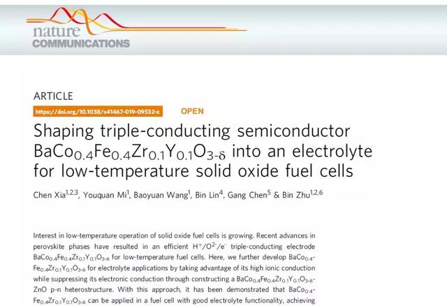 近日,必赢线路检测中心物理与电子科学学院朱斌教授团队在低温固体氧化物燃料电池电解质方面取得突破性进展,相关研究成果以“Shaping triple-conducting semiconductor BaCo0.4Fe0.4Zr0.1Y0.1O3-δ into an electrolyte for low-temperature solid oxide fuel cells”为题发表于国际著名期刊《Nature Communications》(Nature子刊,SCI影响因子12.353)。物电学院青年教师夏晨为论文的第一作者,朱斌教授和汪宝元副教授为共同通讯作者,必赢线路检测中心是该论文的第一完成单位和通讯单位。