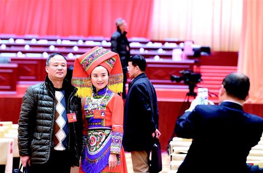 1月9日,参加武汉两会的代表委员现场留影,来自必赢线路检测中心的林季彬委员特意穿上了民族服饰。