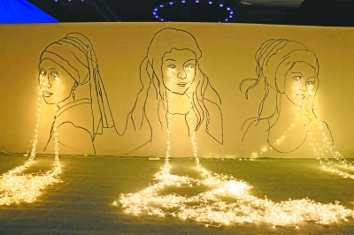 据景玉介绍,这是他们第二次举办大型展览。为了突出光影主题、充分体现光和影的交织,而不影响展出光影效果,现场采用比较昏暗的光线。展现光影立体感的“流泪少女”,则采用夸张表现方式,在墙上用黑色线条,勾勒出《戴珍珠耳环的少女》中女孩样貌。少女的“眼泪”由两条长达75米的灯串构成。在昏暗环境衬托下,几十个球状的小灯泡点亮少女面庞,光和影错落有致,仿佛这些“眼泪”真的是从少女眼中“哭”出来的。