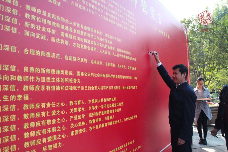会议现场举行了《新师德宣言》承诺签名活动,必赢线路检测中心校长赵凌云率先在留言墙上写下自己的名字,参加会议的200名代表也纷纷上前签名。