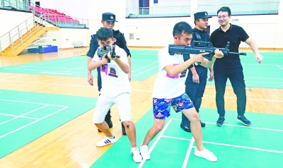 上午10点,大学生们抵达特警支队,此时,六名特警早已等候在警体馆内。6名“猛士突击队”的特警,现场给同学们表演了战术枪操、拆枪组枪。同学们一边叫好一边目不转睛地观看。光看还不过瘾,同学们还在特警的指导下有模有样地学着拆组枪支、端枪前进。没想到看着轻松的动作,自己做起来却很困难,不一会儿便有同学直喊手酸。
