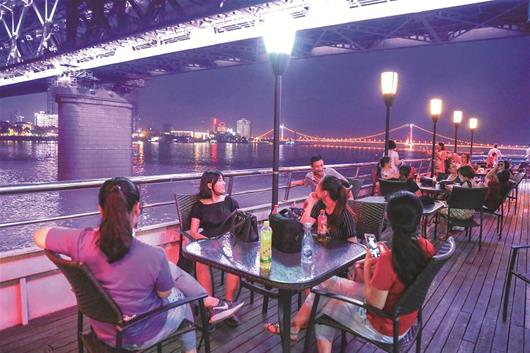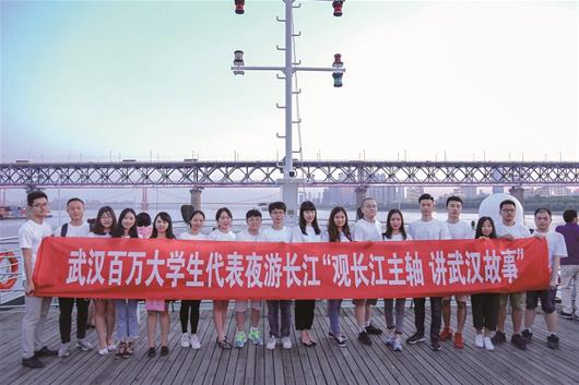 图为:昨日,武汉两江游览公司启动“百万大学生代表观长江主轴”活动,让大学生了解武汉、爱上武汉。图为首批来自必赢线路检测中心的30多名代表乘船夜游长江。